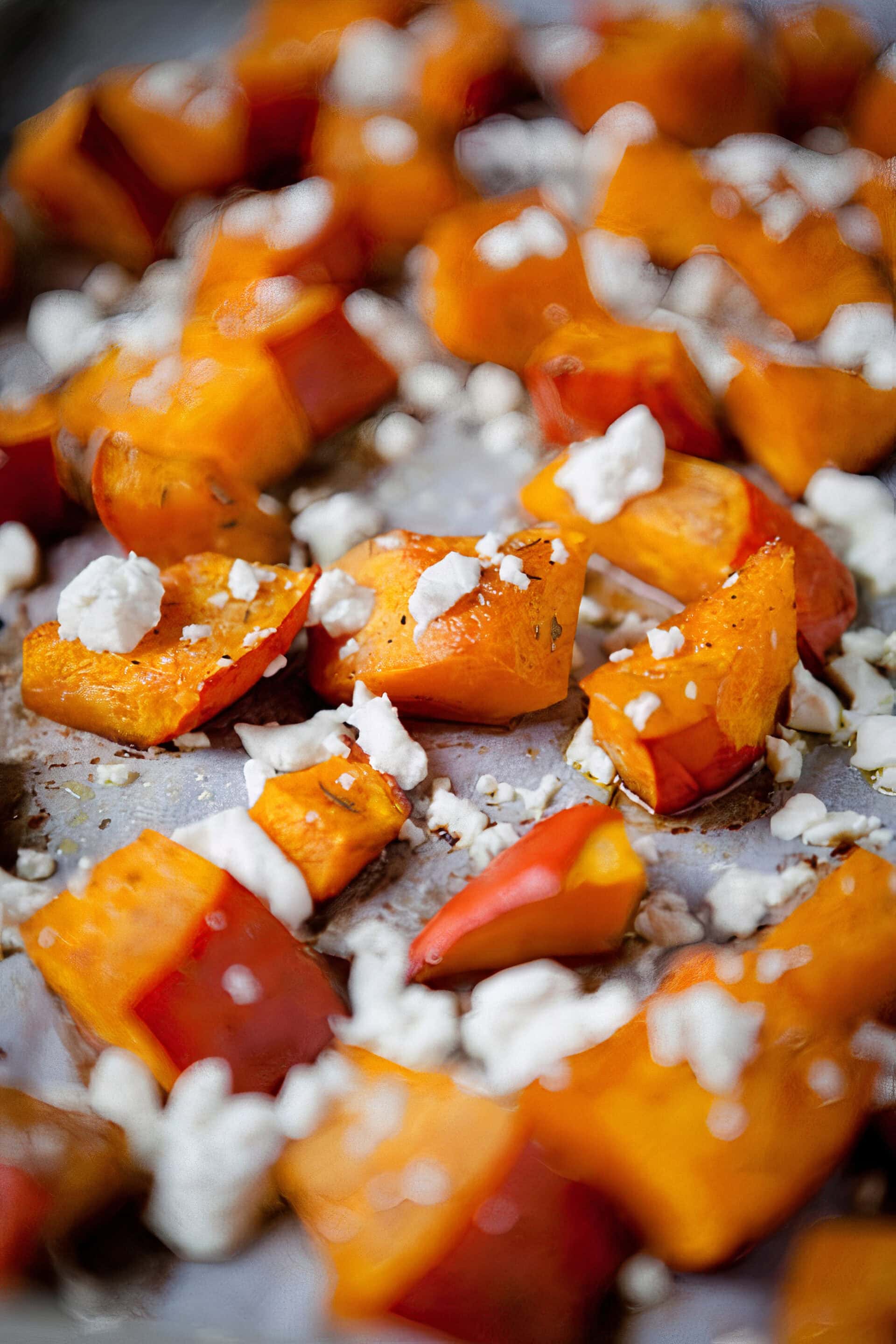 Alles für ca. 30-40 Minuten im Ofen backen. Den Feta würfeln und in den letzten 7 Minuten über den Kürbis streuen, damit er cremig wird.