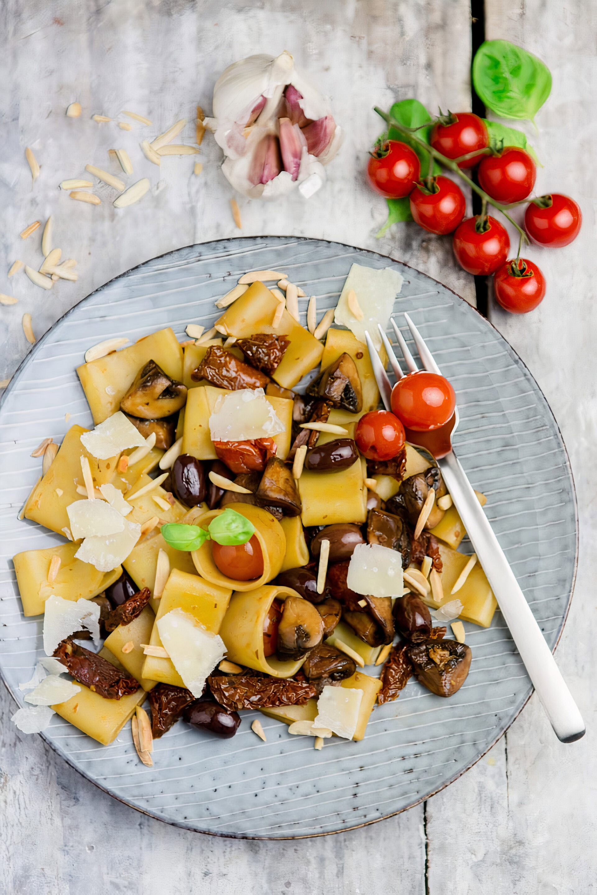 Die Pasta alla Antipasti auf Tellern anrichten und mit den angerösteten Mandelsplittern, etwas gehobeltem Parmesan und frischem Basilikum garniert servieren.