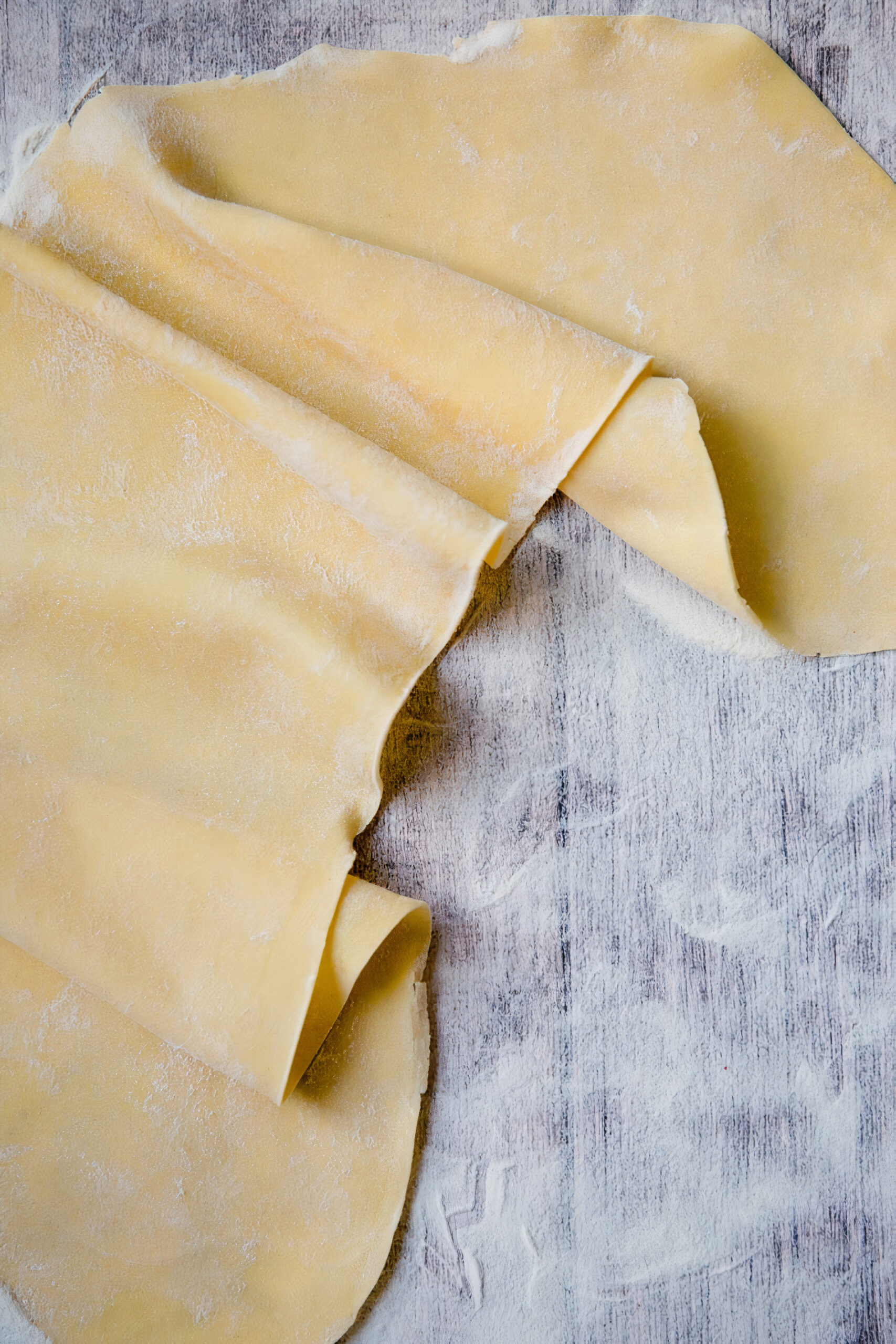 Den Teig in Portionen teilen und mit dem Nudelholz so dünn wie möglich ausrollen. Dabei immer wieder drehen und von der Mitte nach außen rollen. Ziel: 1-2mm Dicke.