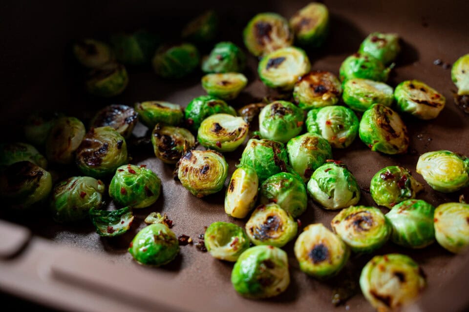 Rosenkohl aus dem Airfryer schmeckt frisch am besten. Die Knusprigkeit lässt nach, wenn er abkühlt.