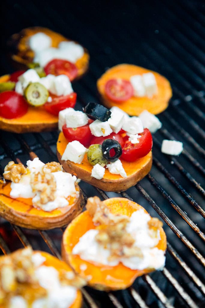 Diese belegten Süßkartoffelscheiben vom Grill habe ich euch heute in zwei Varianten mitgebracht: eine süß mit Ziegenkäse und Honig und eine und eine herzhaft-mediterran mit Feta, Tomaten und Oliven.